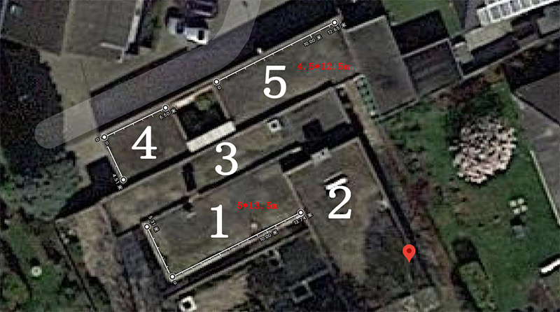 Con base en las fotografías y el mapa satelital proporcionados por el cliente, confirmamos que hay 5 ubicaciones de instalación que se pueden utilizar en el techo.