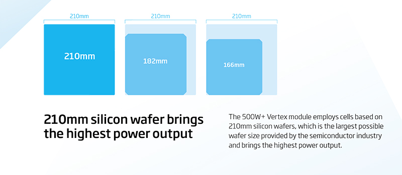 Oblea de silicio de gran tamaño de 210 mm x 210 mm y celda PERC monocristalina, los nuevos paneles permiten una salida de alta potencia de más de