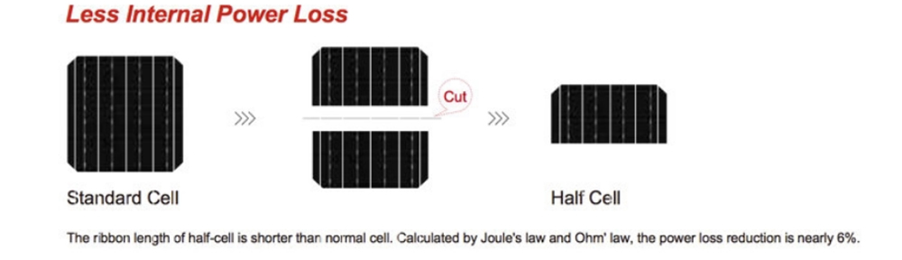 Desde el voltaje de el la celda de silicio cristalino solar es independiente de el área, mientras el el poder es proporcional a el área, el voltaje de la mitad de una celda permanece sin cambios en comparación con el toda celda, mientras el poder y la corriente se reduce a la mitad.