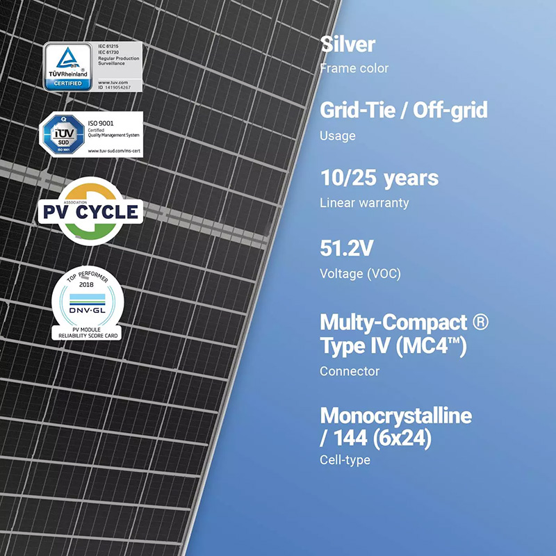hasta un 20% con una potencia máxima de salida de 410 W Este panel tiene mayor tolerancia a la sombra debido a las matrices gemelas y puede soportar cargas pesadas.